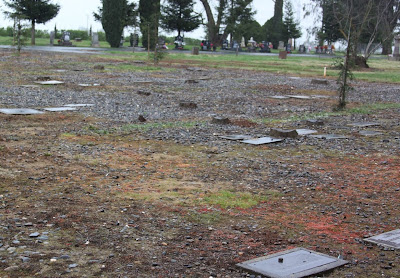 The view from above says a lot- you can see the stark contrast between the lawn portion of the cemetery and the gravel portion by air, though if that were not clear enough I outlined it in blue.
